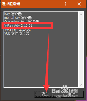 4. 步调3后弹出【选择衬着器】窗口,如下图所示,选择【V-Ray Adv...】->【确定】。