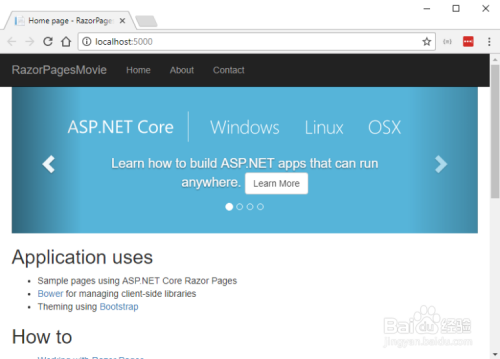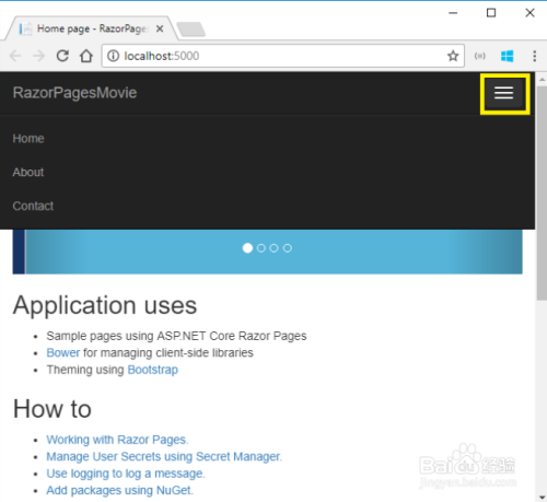 默认模板建立“RazorPagesMovie”、“本家儿页”、“关于”和“联系人”链接和页面。 可能需要单击导航图标才能显这些链接,具体取决于浏览器窗口的大小,如下图所示: