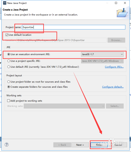 2. 为建立的New java Project设置名称、位置等->点击finish