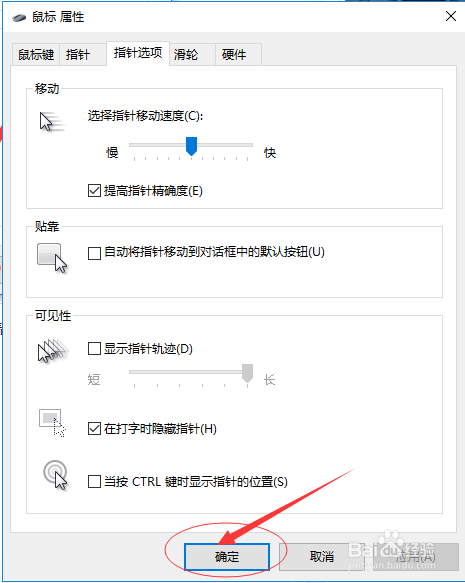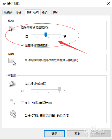 在鼠标属性中,切换到“指针选项”,如下图所示: