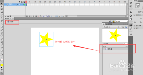 点击场景1进入场景1编纂,打开“库”面板,这时辰会看我们在库里面有我们之前绘制的元件五角星,选中五角星将其拖参加景1中。