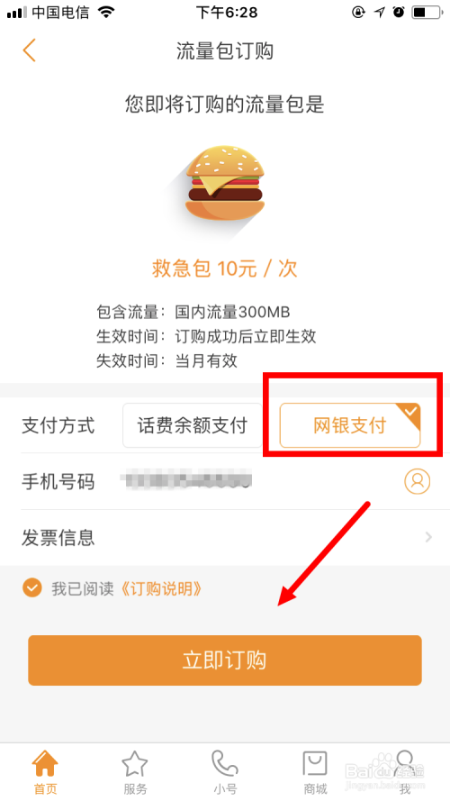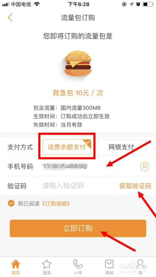 选择好流量包后,点击订购,会呈现流量包订购的页面。在此页面首先输入手机号码,在选择付出体例。好比用德律风余额付出,就需要点击获取验证码,输入手机收到的验证码后,点击当即订购即可。
