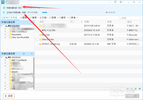 此中扫描分为两个步调,第一个是快速扫描,第二个是深度扫描,当然深度扫描会进行更深切的搜刮已消逝数据,左上角位置查看,如图。