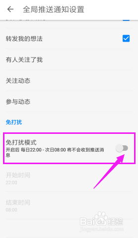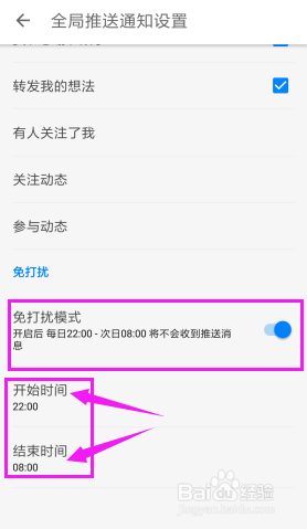默认是22点到8点。我们点击起头时候和竣事时候可以点窜免打搅模式的时候。
