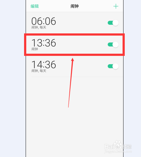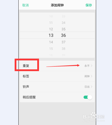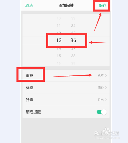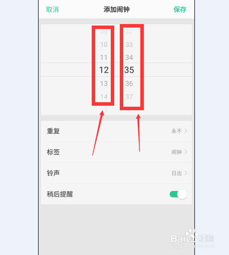 呈现添加闹钟的页面。在此上下拉动标识表记标帜出来的这两排数字,选中时候某点某分。