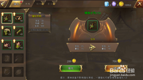 强化的页面,只要左上角的装备有箭头图标,申明可以强化,选摘要强化的装备,点击强化这一项。