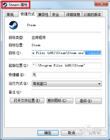 找到【快捷体例】中的【方针】,接下来在后面的文字中输入【-console】。