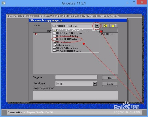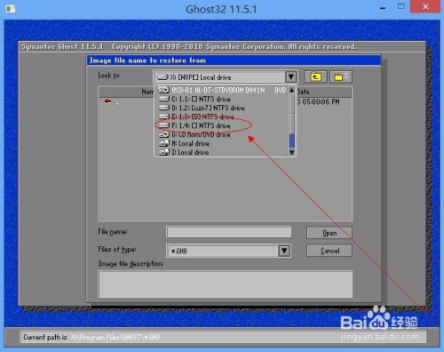 选择备份文件地点的磁盘目次,本例为F盘。