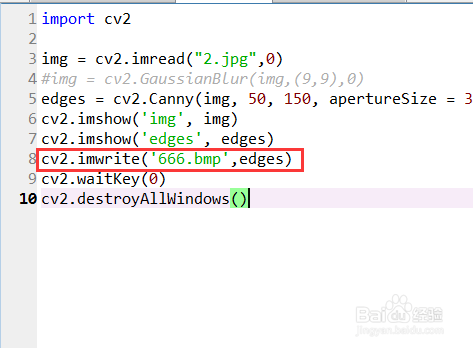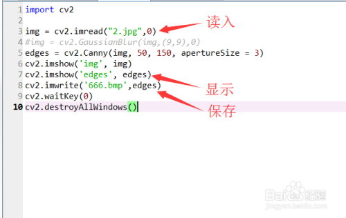接着如下图,进行彩色图片读入和显示,第一行为载入库函数,针对当前安装的Opencv版本,后方为cv2,对于其他数字2需要改动。同时也可看到输入、输出函数,最后两行为利用Opencv必需添加的语句。