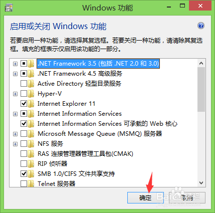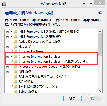 弹出Windows功能窗口,勾选红框中的“Internet Information Server”和“Internet Information Server可承载的Web焦点”,这里我已经安装过IIS了,所以显示的已经勾选了,没安装过IIS的必需勾上这两个选项;有的电脑可能系统分歧显示的是“Internet 信息办事”和“万维网办事”,勾上这两个选项即可