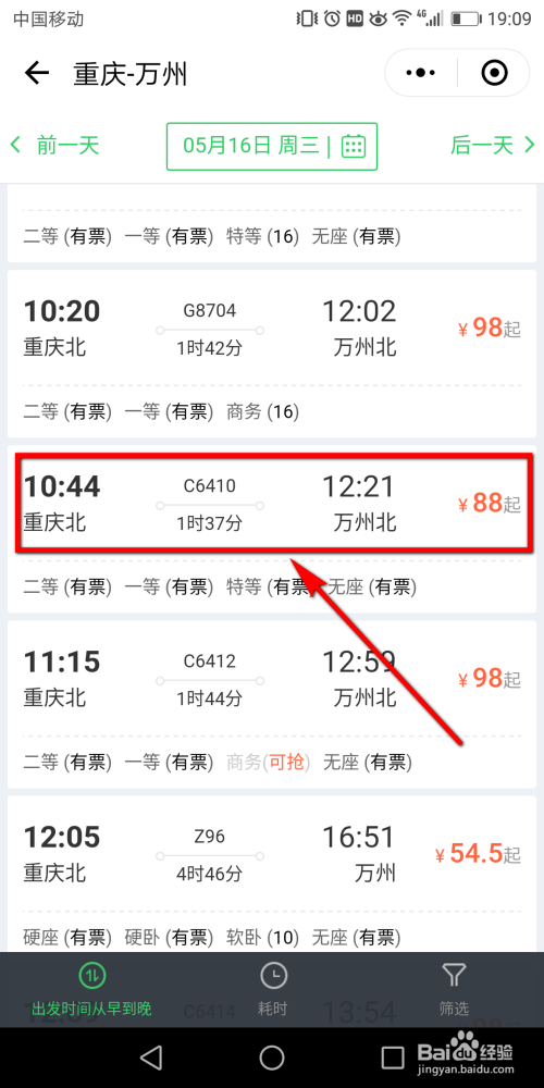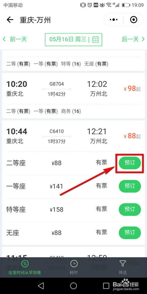 查询成果是一个列表,列表中有合适要求的所有车次,按照你的出发时候和抵达时候,在列表中点击选择此中一个车次。