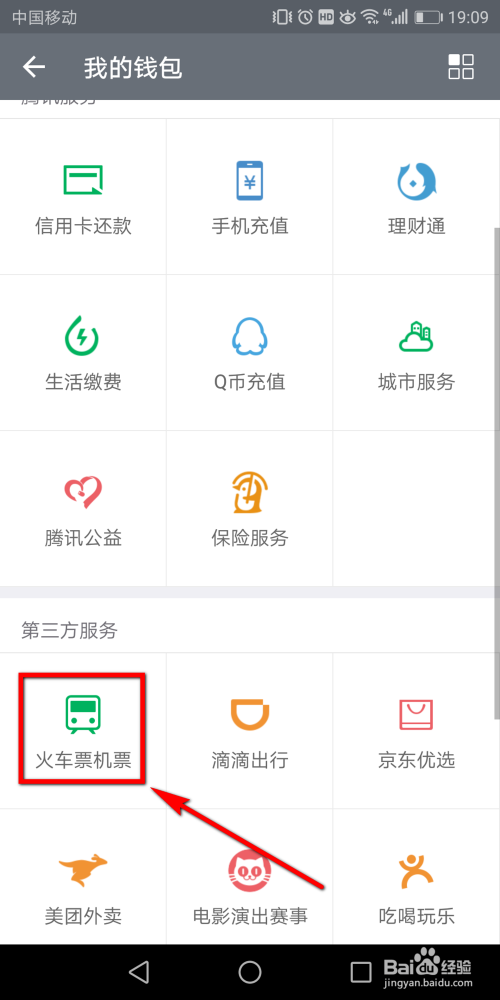 进入钱包今后,往下拉动页面至图示位置,并点击【火车票机票】。