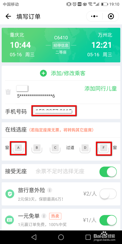 回到信息填写页面,填写好搭车人的手机号码,在手机号码填写位置下方就有在线选座功能,此中A和F都属于靠窗的座位,我们点击此中一个就可以了。