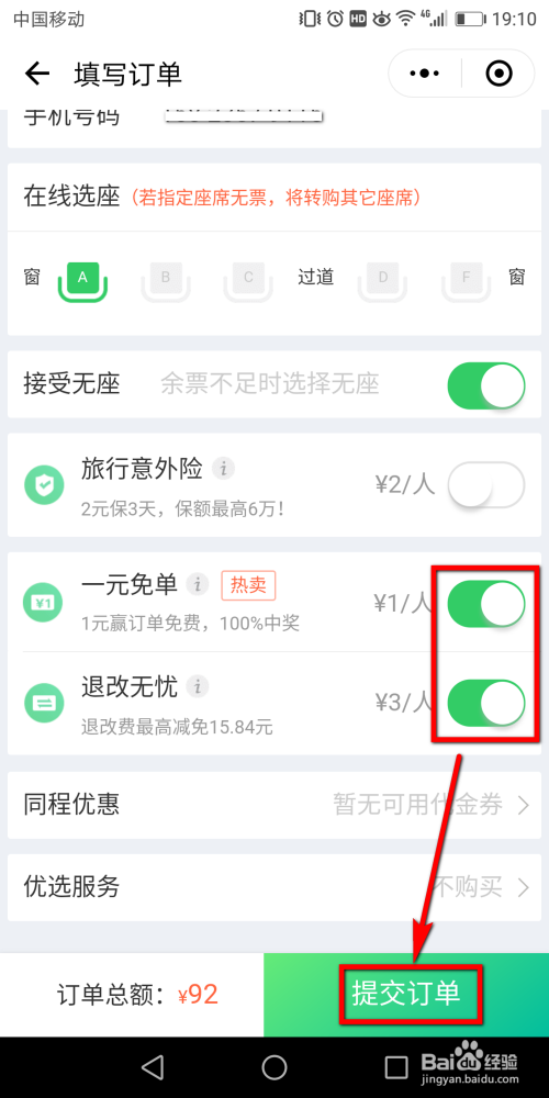 选好座位后,往下拉动页面,并点击图示位置的滑块,封闭这两项功能,封闭后点击【提交订单】。