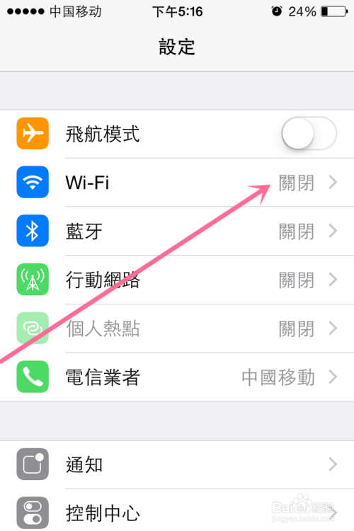 点击设定图标后,我们可以看到良多菜单,此中有一个菜单为WI-FI。如下图箭头所示,显示封闭状况,我们需要打开它。
