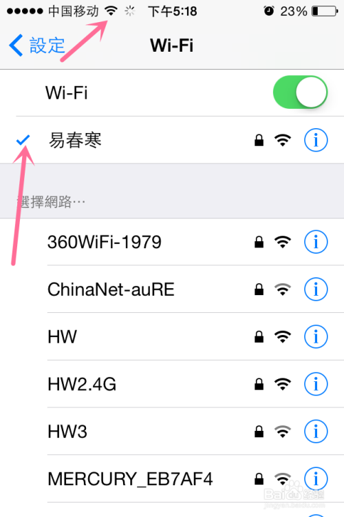 打开WI-FI的状况是会显示绿颜色的。如下图箭头所指标的目的的位置。