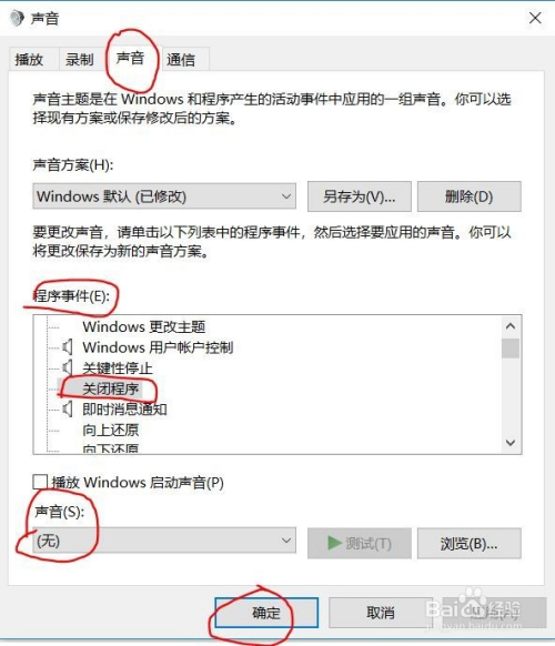 在【声音】选项卡中的【法式事务】框中,单击【封闭法式】,鄙人面的【声音】下拉菜单中选择【无】,然后单击【确定】,最后封闭电脑;若是Windows可以正常封闭了,申明是由退作声音文件所引起的。