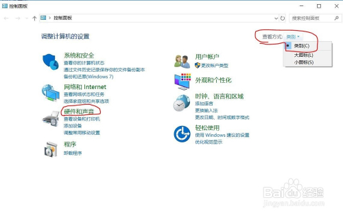 进去后选择【查看体例】为【类别】,然后单击【硬件和声音】进入,进去后选择【办理音频设备】。