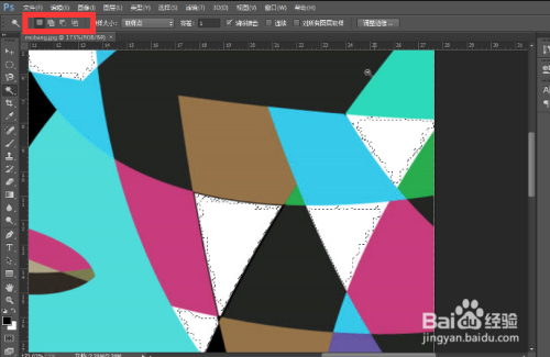 假如只想选右上方一块,勾选持续,就会在统一块区域中选中一块,只要有离隔的颜色,就不会拔取其它枚红色色块。如图2