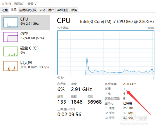 然后,窗口就会显示出CPU、内存、磁盘、以太网的菜单,此时显示出的是CPU机能状况,其插槽有一个。
