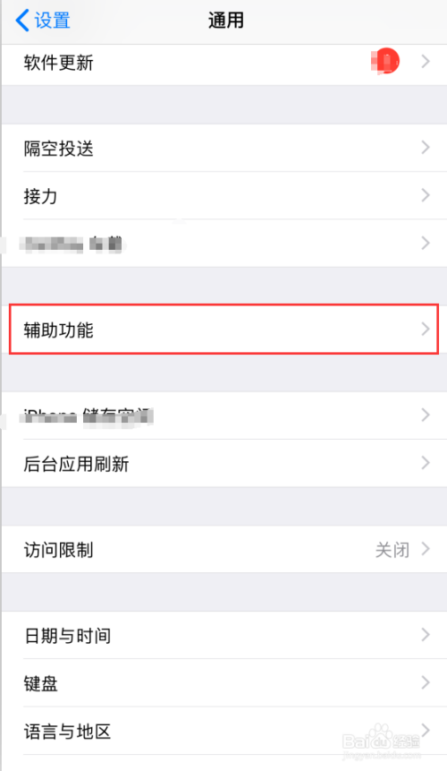 3. 在通用页面下,找到下图所示的【辅助功能】选项,点击进入。