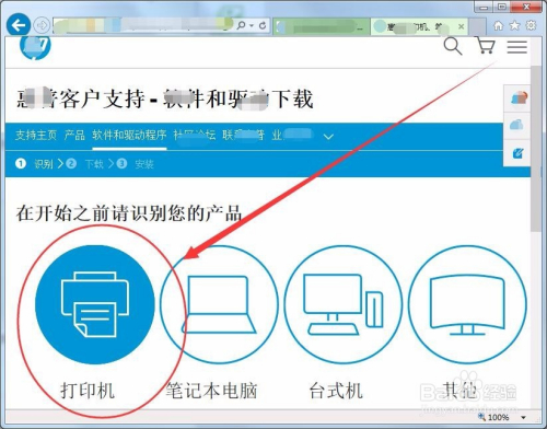 惠普软件和驱动下载官网中,首先要识别本身的产物,选择打印机。