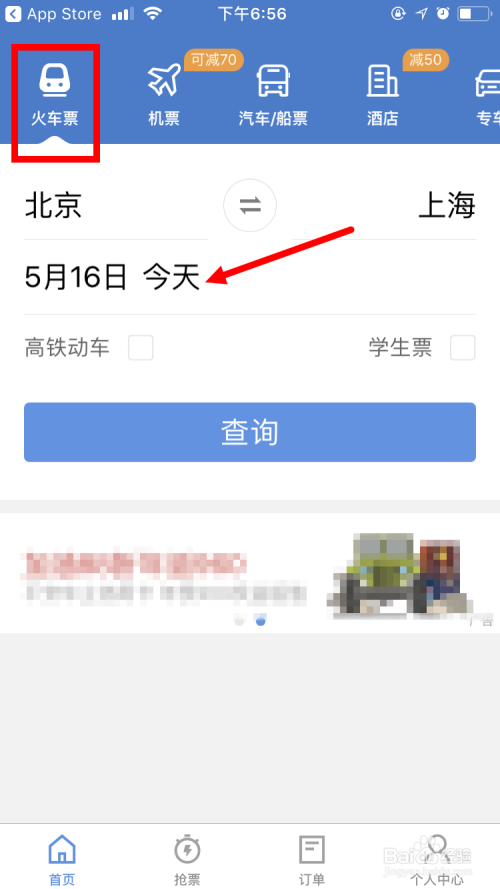 首先是要打开并登录执行火车票App,并在火车票的页面里,首先选择搭车日期。