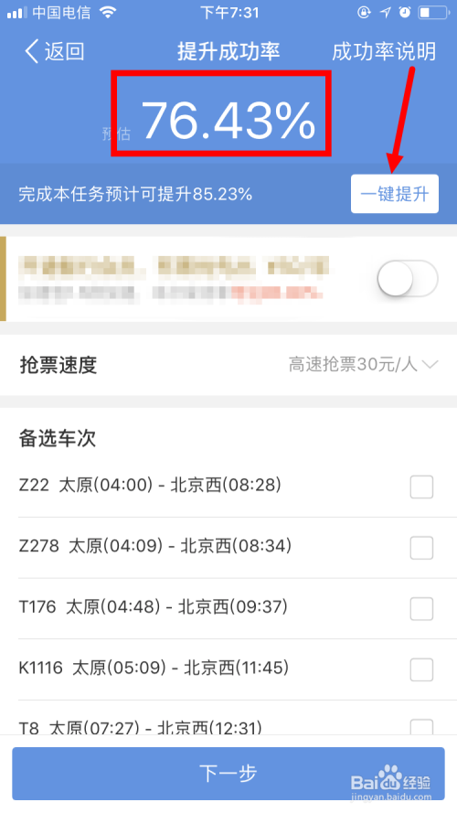 之后,进入晋升当作功率的页面。在此页面,可以看到预估的抢票当作功率。如想晋升当作功率,可以点击一件晋升。