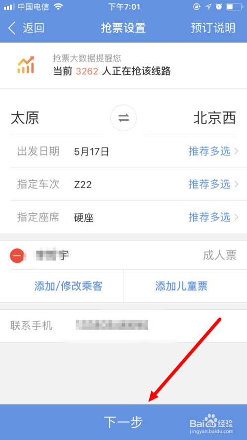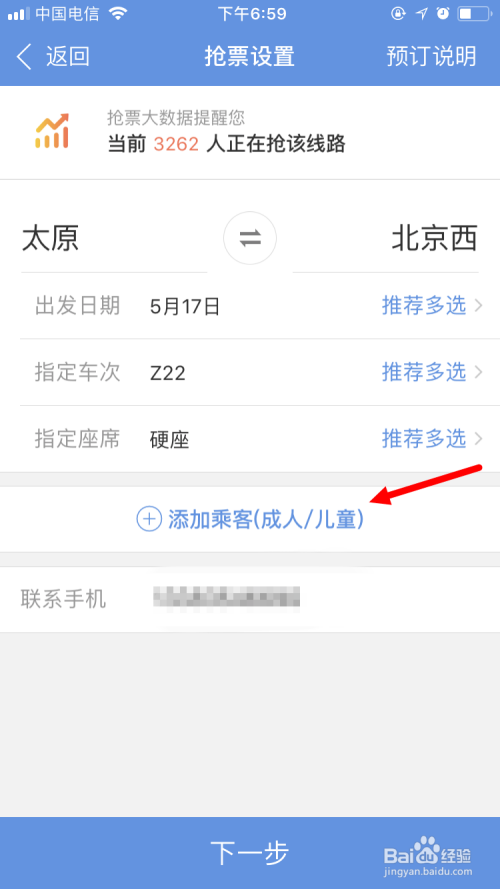 点击抢票后,需要添加乘客,再点击下一步。
