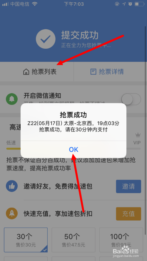 回到App,先点击OK,再点击抢票列表。