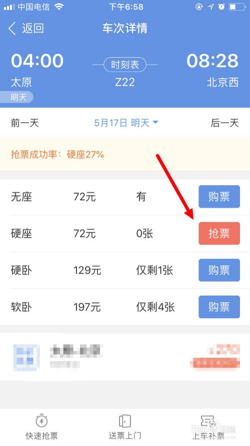 接下来,选择好车次后,在车次详情页面可以看到各类车票环境。若有车票点击购票即可。如临时无车票,便可点击抢票,尝尝手气。我们具体来看看抢票的流程。