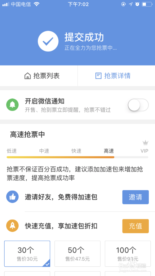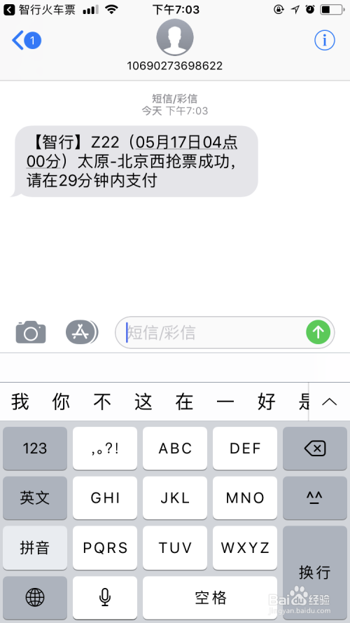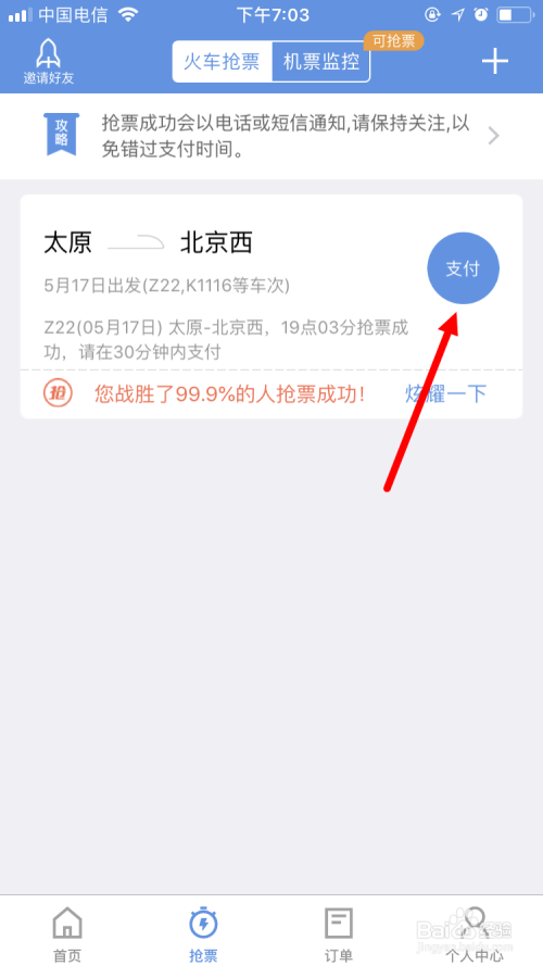 小编选择 抢到票,在付票条目。提交当作功后,几分钟内,会收到抢票当作功的短信提醒。
