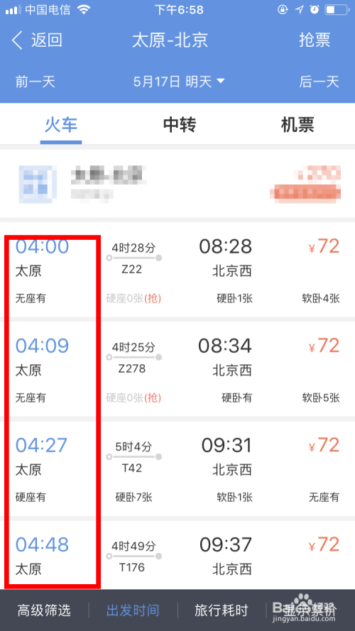 鄙人图所示的页面中,可以看到搭车日期当天的所有车次,以及站票、硬座、软座和软卧的残剩环境。