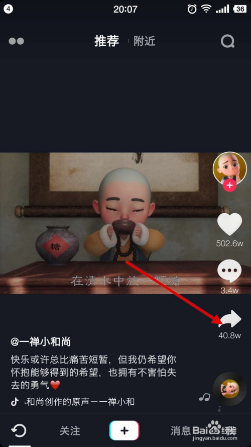 进入抖音小视频后,我们找到本身需要下载的视频,我们点击界面上有一个“分享”按钮如图。