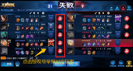 若是游戏已经竣事,那么依旧点击适才的三条线查看游戏对决的详情,此时会在右面右上角显示一个举报的红色赞叹号图标;