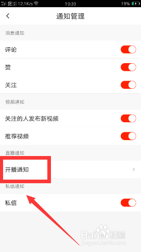 开播通知会显示为开启,会显示开播提醒的本家儿播,点击封闭开播通知。
