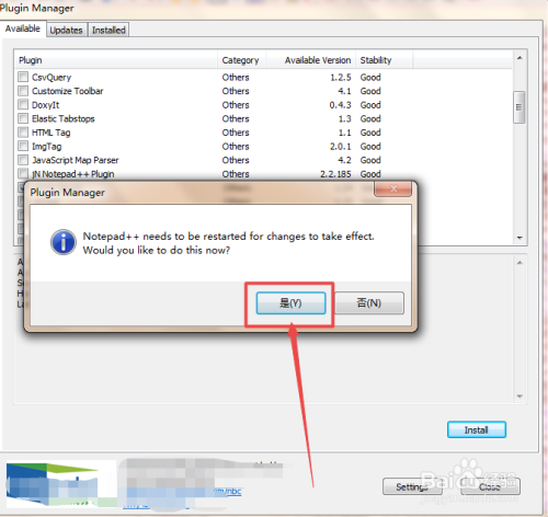 将它前面框中的勾勾上,然后点击右下角的Install按钮,它就会起头安装了,在安装完当作之后,会弹出一个重启Notepad++编纂器的提醒窗口,点击是 。