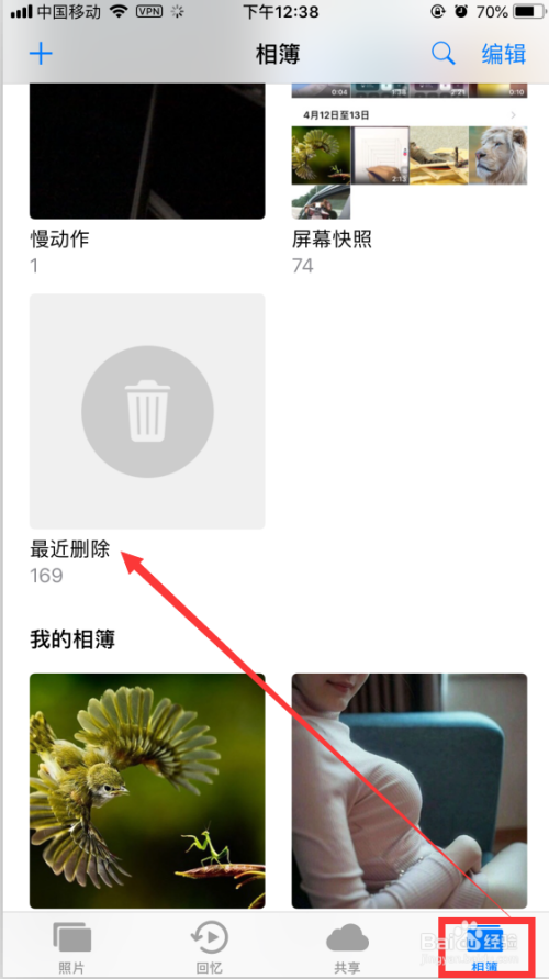 3. 步调2后,选择【相簿】,并在改面板下找到【比来删除】项,如图所示并点击该项。