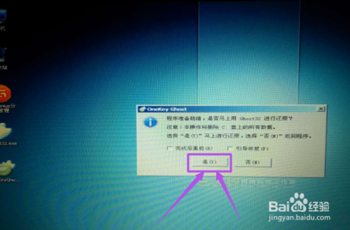 一会之后,就会进入到U盘启动盘中,在桌面的位置可以看到有5个图标,双击 OneKey Ghost图标来运行它,在弹出的窗口中点击 是 。