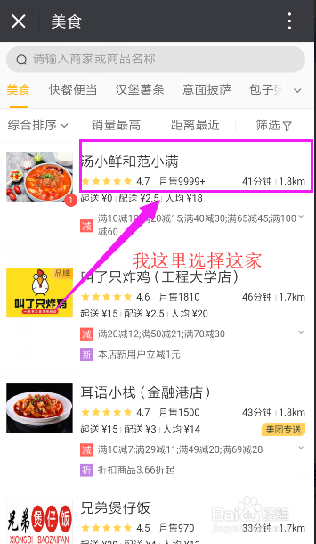 这时,就看到你四周的美食店了,然后,选择某家店点击进入,如图所示