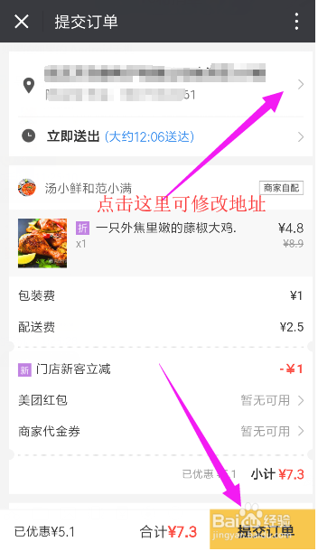 接着,来到提交订单页面,注重收成地址要准确,也可以点窜系统定位的地址,点击如图所示的位置就可以点窜了,点窜好了后,点击提交订单,如图所示