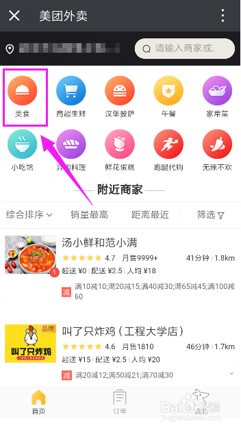 进入“美团外卖”,来到首页,点击“美食”,如图所示
