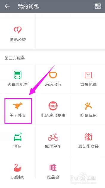 进入“我的钱包”页面,找到第三方办事,点击下面的“美团外卖”,如图所示