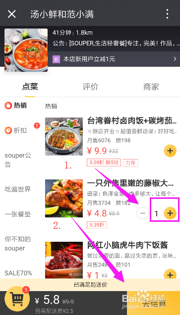 进入店里后,可以查看你所喜好吃的美食,点击后面的“+”,插手购物车,点击去结算,如图所示