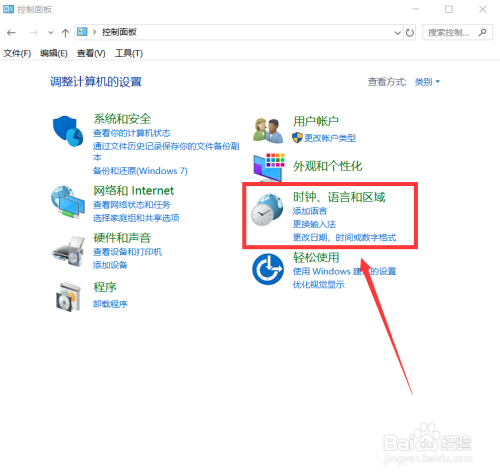 在节制面板“调整计较机设置”中,找到“时钟、说话和区域”如图。