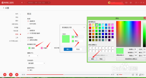 在“更改颜色方案”选项中,点击“已播放”和“未播放”中更改颜色,要注重,这两个选项颜色要设置当作纷歧样的颜色,才能显示歌词滚动。