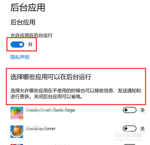 进入后台应用界面,如下图,上方有总开关,若是封闭此按钮,所有应用后台利用,均会被禁止。框选内容介绍了后台启动的感化,以及封闭后可节电。