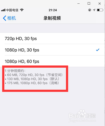 随便点进去一个,例如说1【录制视频】可以看到有3个选项供我们选择,下边标红处有每个选项录制1分钟视频所占手机内存的数据,可以按照本身的要求来选。当然,若是考虑到节流空间,就选720p,30fps。