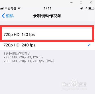 同理,设置2、【录制慢动作视频】,考虑到节流空间只能选720p,120fps。