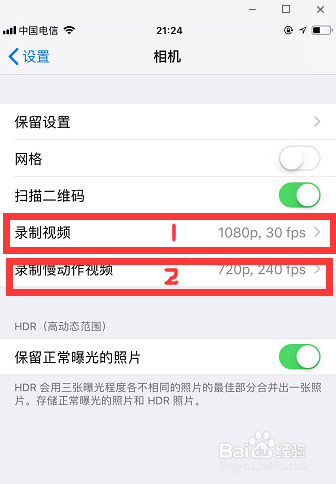 点进去可以看到1、【录制视频】和2、【录制慢动作视频】两个选项。后边的数字1080p代表分辩率,数字越年夜暗示分辩率越高,照片越清楚,所占的内存就越年夜;30fps代表每秒传输图像帧数,也是数字越年夜越流利但所占空间就越年夜。